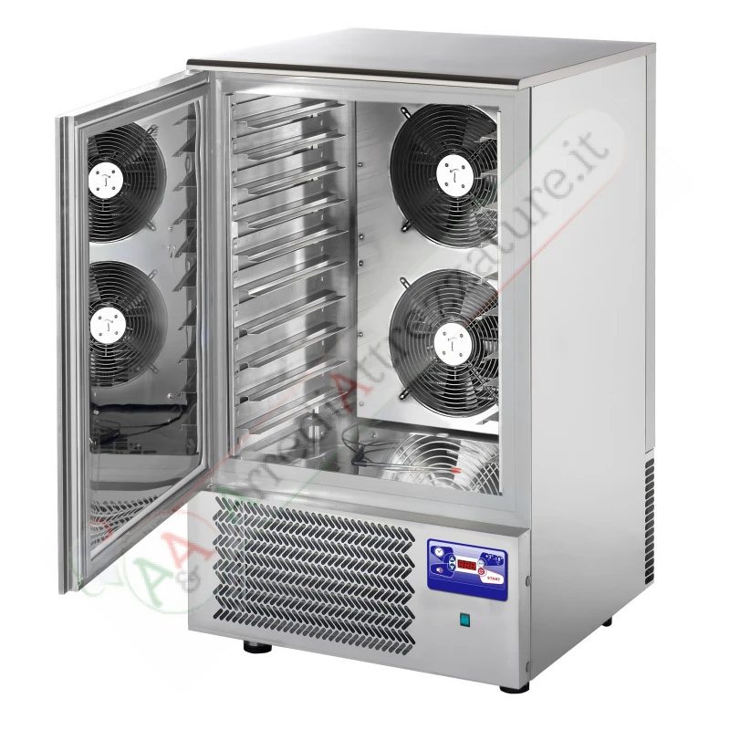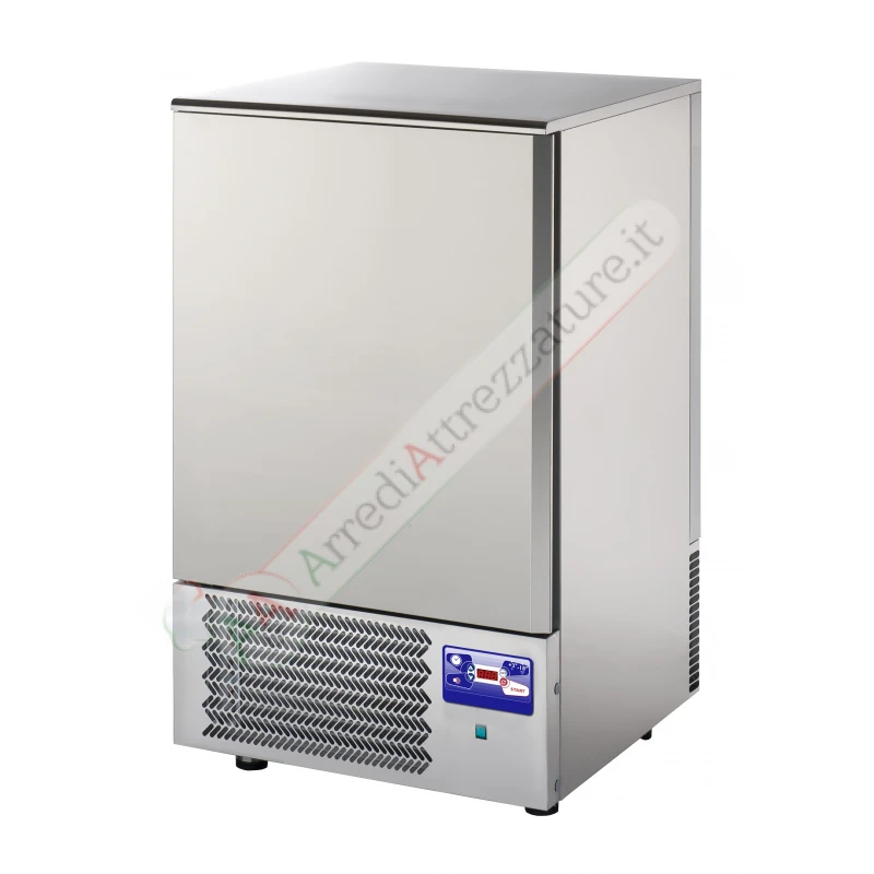 Interno ed esterno in acciaio inox ad esclusione del fondo esterno in acciaio galvanizzato. Angoli interni arrotondati. Isolamento in poliuretano senza CFC, iniettato ad alta pressione. Spessore dell’isolamento: 60 mm. Piano superiore removibile, porta con chiusura automatica e guarnizione magnetica. Pannello frontale con scheda di controllo elettronica con sonda camera PTC e sonda spillone al cuore. Refrigerazione ventilata con agitatore d’aria. Unità refrigerante facilmente estraibile e tropicalizzata di serie (temperatura ambiente +30°C ed umidità relativa del 60%) funzionante con gas R404A/R507. Vano posteriore apribile e unità asportabile, per una facile manutenzione. Sbrinamento evaporatore a tempo, a fine ciclo, e vaschetta inferiore di contenimento acqua di condensa. Cicli impostabili con sonda al cuore +3°C e -18°C, oppure a tempo. Piedi in Acciaio Inossidabile regolabili in altezza (60/90 H mm). Adatti a contenere sia griglie GN 1/1 che teglie 600×400 mm.