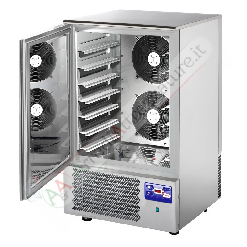 Interno ed esterno in acciaio inox ad esclusione del fondo esterno in acciaio galvanizzato. Angoli interni arrotondati. Isolamento in poliuretano senza CFC, iniettato ad alta pressione. Spessore dell’isolamento: 60 mm. Piano superiore removibile, porta con chiusura automatica e guarnizione magnetica. Pannello frontale con scheda di controllo elettronica con sonda camera PTC e sonda spillone al cuore. Refrigerazione ventilata con agitatore d’aria. Unità refrigerante facilmente estraibile e tropicalizzata di serie (temperatura ambiente +30°C ed umidità relativa del 60%) funzionante con gas R404A/R507. Vano posteriore apribile e unità asportabile, per una facile manutenzione. Sbrinamento evaporatore a tempo, a fine ciclo, e vaschetta inferiore di contenimento acqua di condensa. Cicli impostabili con sonda al cuore +3°C e -18°C, oppure a tempo. Piedi in Acciaio Inossidabile regolabili in altezza (60/90 H mm). Adatti a contenere sia griglie GN 1/1 che teglie 600×400 mm.
