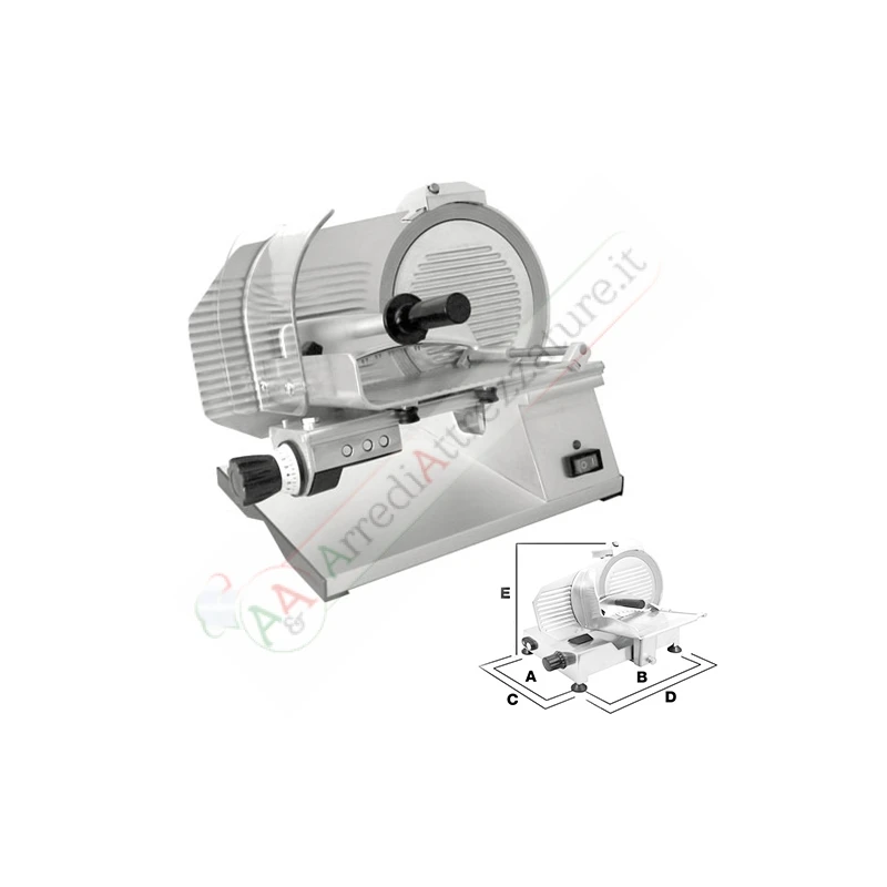 Struttura in alluminio anodizzato, supporto lame con doppio cuscinetto a sfera, motore ventilato professionale con protezione termica, trasmissione a ingranaggi, lama acciaio inox antiaderente, interruttore marcia/arresto con riarmo, durezza filo tagliente HRC 58-59, a norma CE professionale.