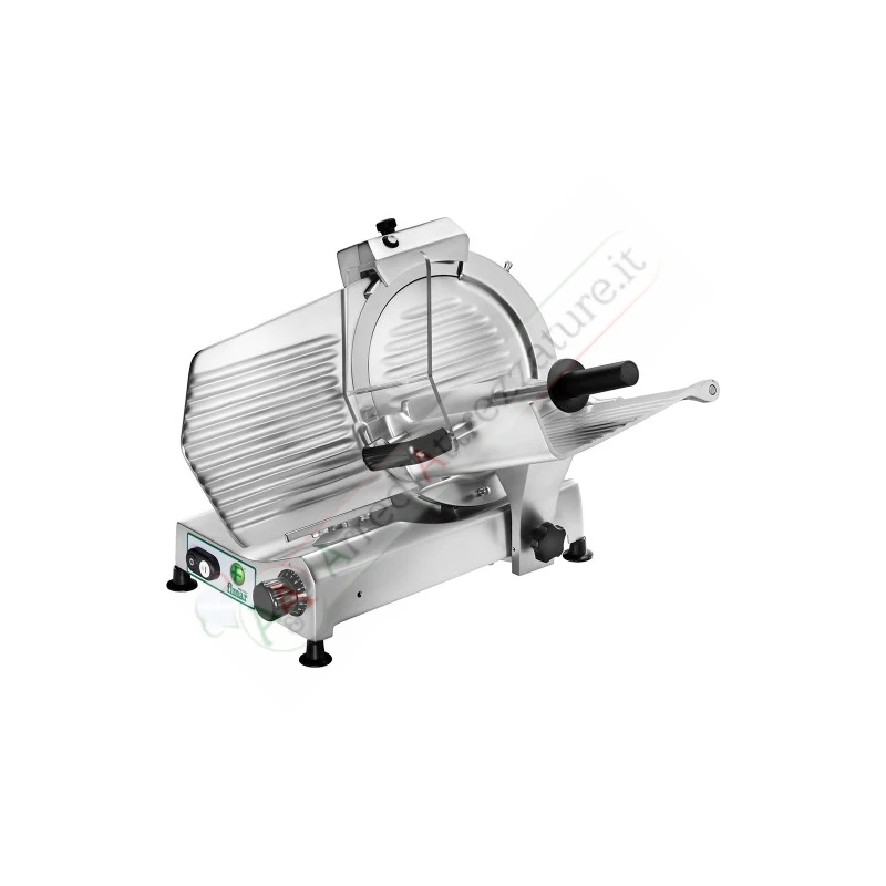Macchina per affettare salumi, formaggi, ecc. Struttura in lega leggera di alluminio anodizzato (fusione in conchiglia) – anello fisso protezione lama – paralama estraibile – pomello regolazione vela con scala graduata – affilatoio fisso con coppia di smerigli per l’affilatura della lama. Blocco piatto-vela per rimozione carrello