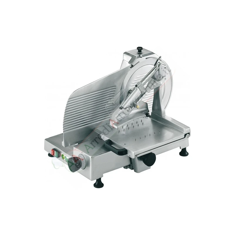 Macchina per affettare salumi, carne, formaggi, ecc. Struttura in lega leggera di alluminio anodizzato – blocco piatto- anello fisso protezione lama – paralama estraibile – pomello regolazione vela con scala graduata – affilatoio fisso con coppia di smerigli per l’affilatura della lama. Le affettatrici verticali possono essere fornite, a richiesta, con piatto carne-vela per rimozione carrello.