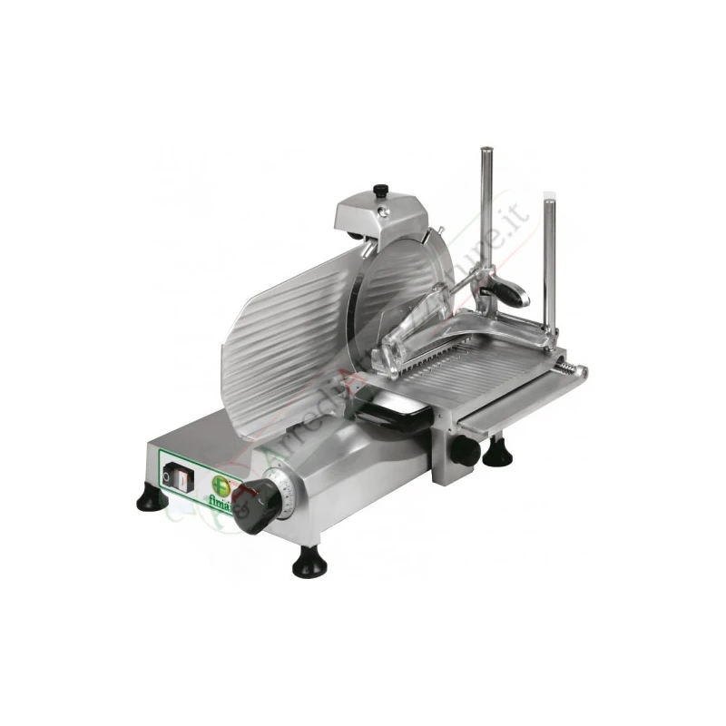 Macchina per affettare salumi, carne, formaggi, ecc. Struttura in lega leggera di alluminio anodizzato (fusione in conchiglia) – blocco piatto- anello fisso protezione lama – paralama estraibile – pomello regolazione vela con scala graduata – affilatoio fisso con coppia di smerigli per l’affilatura della lama. Le affettatrici verticali possono essere fornite, a richiesta, con piatto carne.