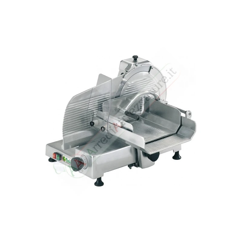 Macchina per affettare salumi, carne, formaggi, ecc. Struttura in lega leggera di alluminio anodizzato – blocco piatto- anello fisso protezione lama – paralama estraibile – pomello regolazione vela con scala graduata – affilatoio fisso con coppia di smerigli per l’affilatura della lama. Le affettatrici verticali possono essere fornite, a richiesta, con piatto carne-vela per rimozione carrello.