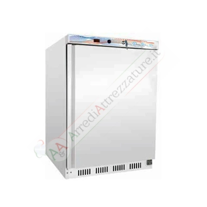 Armadio refrigerato con struttura esterna in lamiera verniciata epossidica bianca, interno ABS. Refrigerazione statica con ventilatore interno per uniformare la temperatura. Pannelli esterni di fondo e retro in lamiera zincata. Capacità di 120 litri. Temperatura di esercizio: -18° -22° C