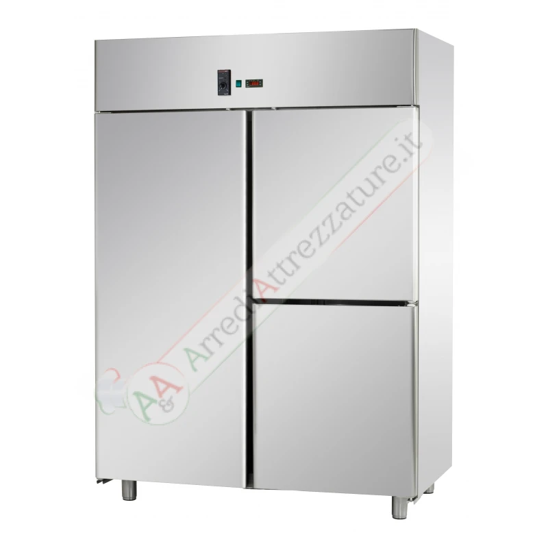 Interno ed esterno in acciaio inox eccetto fondo, soffitto e schienale esterni in acciaio galvanizzato. Angoli interni arrotondati. Isolamento in poliuretano senza CFC, iniettato ad alta pressione. Spessore dell’isolamento: 60 mm. Porte a chiusura automatica con guarnizione magnetica. Pannello di controllo elettronico frontale con sonda NTC. Unità refrigerante a monoblocco estraibile e tropicalizzata di serie (temperatura ambiente +30°C ed umidità relativa del 60%) funzionante con gas R404A/R507. Armadi disponibili anche nella versione senza unità refrigerante. Sbrinamento ed evaporazione dell’acqua di condensa completamente automatici. Piedi in acciaio inox regolabili in altezza. Armadi combinati disponibili esclusivamente con evaporatore all’interno della camera refrigerata. Design compatto.