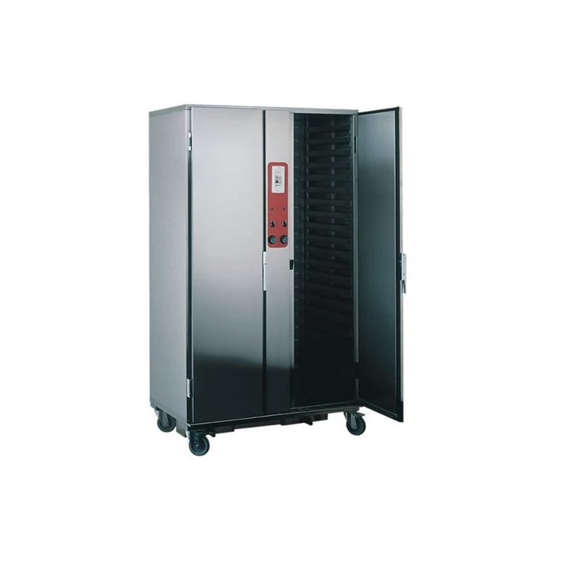 Cella di lievitazione interamente realizzata in acciaio Inox AISI 304. Dotata di guide ad incastro, quadro comandi a norma con interruttore generale magnetotermico, termostati di regolazione collegati tramite sonda alle rispettive vaschette. Capacità 40 teglie 60×40, 2 vani indipendenti (teglie non incluse).