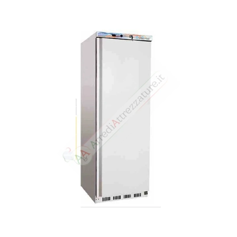 Armadio refrigerato con struttura esterna in lamiera verniciata epossidica bianca, interno ABS. Refrigerazione statica con ventilatore interno per uniformare la temperatura. Pannelli esterni di fondo e retro in lamiera zincata. Capacità di 600 litri. Temperatura di esercizio: +2° +8° C