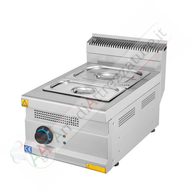 Bagnomaria elettrico da banco in acciaio inox con serbatoio per vasca alimentare monoblocco, temperatura regolabile 30-120°C dotata di piedini regolabili. Facile da pulire.