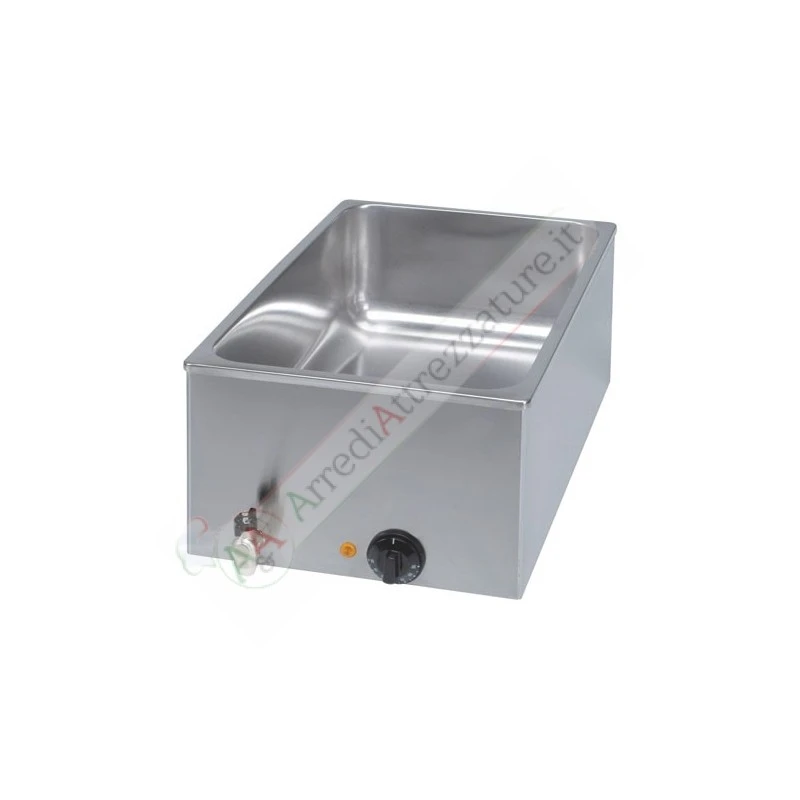 Corpo in acciaio inox, vasche in acciaio inox, sistema di riscaldamento a mezzo piastra riscaldante a contatto, adatte per contenitori GN fino a mm 160 di profondità, con rubinetto di scarico.
