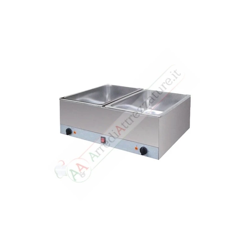Corpo in acciaio inox, vasche in acciaio inox, sistema di riscaldamento a mezzo piastra riscaldante a contatto, adatte per contenitori GN fino a mm 160 di profondità, senza rubinetto di scarico.