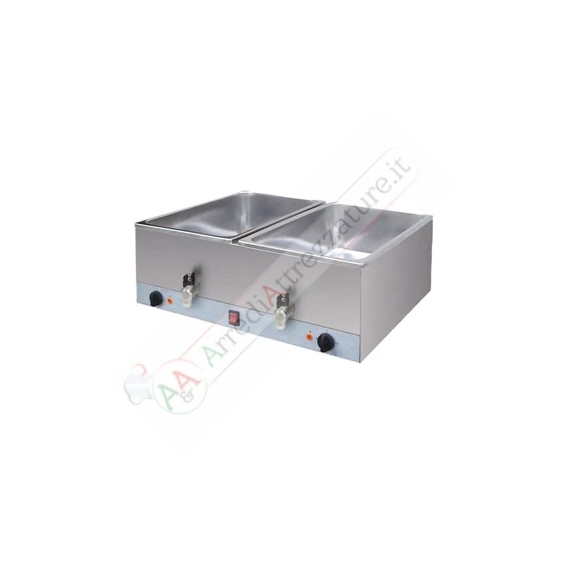 Corpo in acciaio inox, vasche in acciaio inox, sistema di riscaldamento a mezzo piastra riscaldante a contatto, adatte per contenitori GN fino a mm 160 di profondità,con rubinetto di scarico.