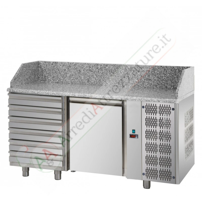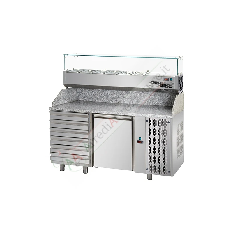 Questo tavolo è adatto per le teglie 60×40 ed è possibile averlo nelle variante con sei cassetti neutri o con l’accessorio della vetrina refrigerata (vaschette non incluse nel prezzo).
