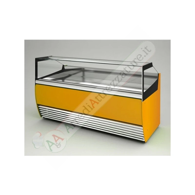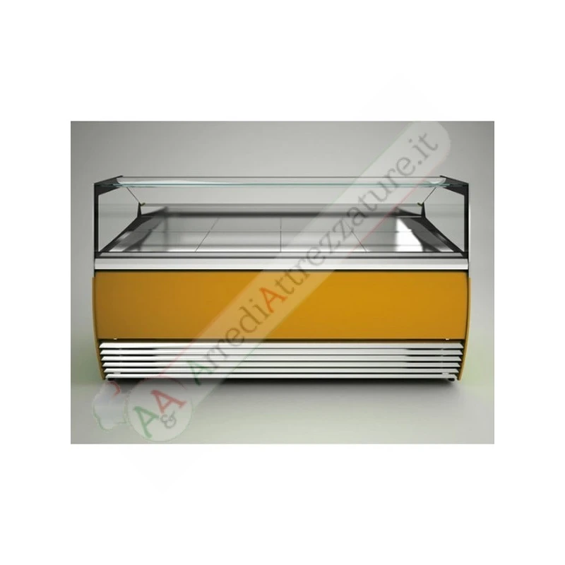 Vetrina con pannello frontale in poliuretano rigido verniciato e pannelli laterali in stratificato 12mm. Colore standard giallo.