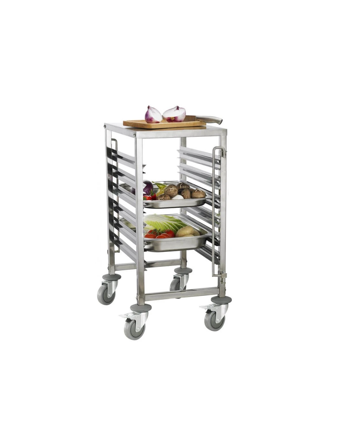 Le sue dimensioni e la versatilità nella gestione di diversi formati di vassoi e teglie (tra cui GN 1/1, 1/2, 1/3 e 2/3 con una profondità massima di 65 mm) lo rendono un compagno ideale per l’organizzazione e la distribuzione degli alimenti.
