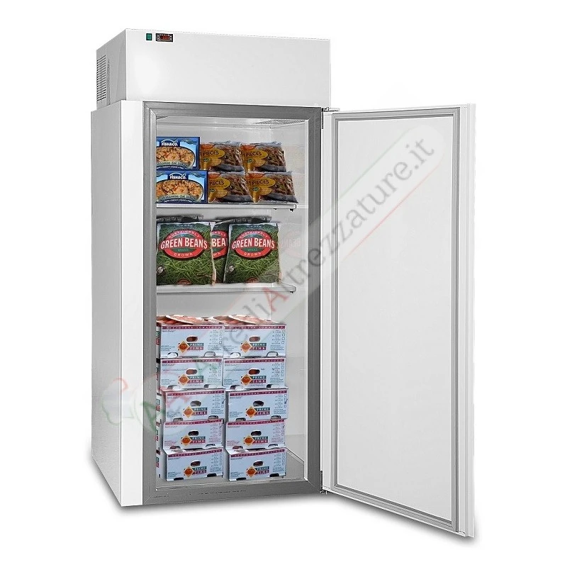 La minicella è composta da 6 pannelli con fissaggio a gancio, pavimento in acciaio inox, porta con chiusura automatica, monoblocco a soffitto con evaporazione automatica dell’acqua di condensa, fissato sul pannello tetto. La minicella è consegnata di serie montata e pronta per l’installazione.