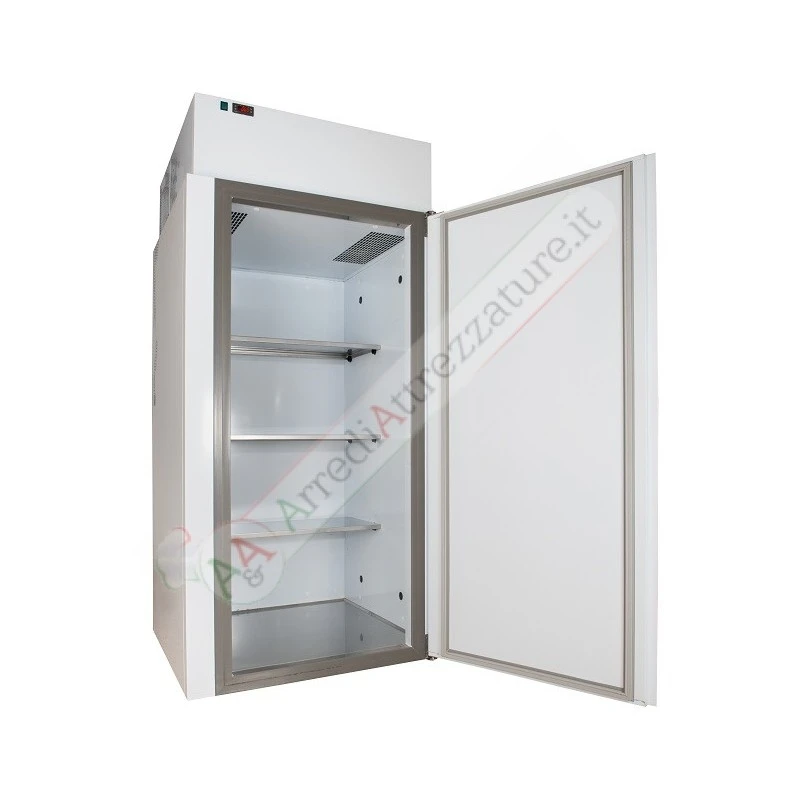 La minicella è composta da 6 pannelli con fissaggio a gancio, pavimento in acciaio inox, porta con chiusura automatica, monoblocco a soffitto con evaporazione automatica dell’acqua di condensa, fissato sul pannello tetto.