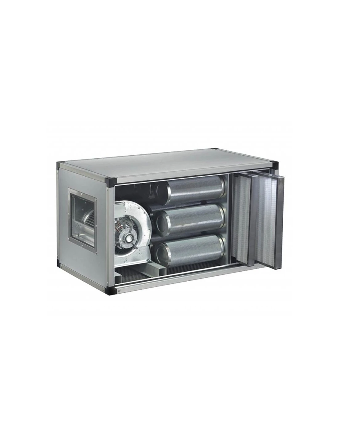 Centralina di deodorizzazione e filtrazione dell’aria completa di ventilatore a doppia aspirazione a rotore esterno. Prefiltro aria tipo EU3,85% gravimetrico con carbone attivo vegetale in cilindrettitipo207/C.Telaioin profilato di alluminio, Singola pannellatura in acciaio inossidabile all’esterno e materassino fonoassorbente all’interno.
