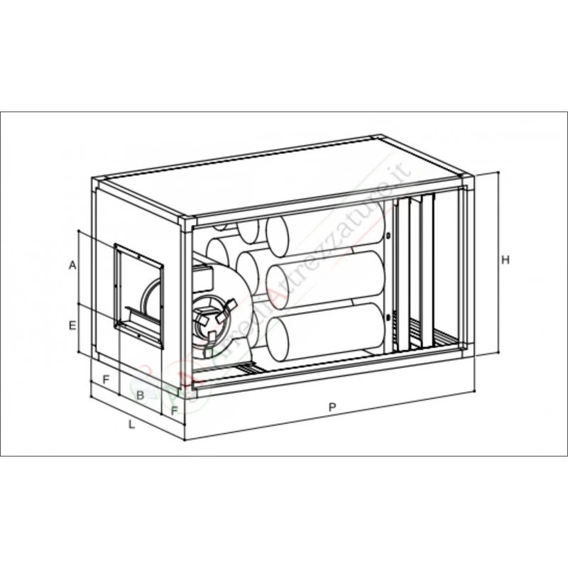 Centralina di deodorizzazione e filtrazione dell’aria completa di ventilatore a doppia aspirazione a rotore esterno.