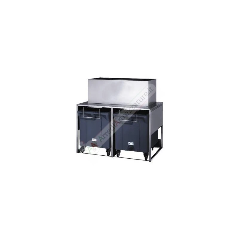 Contenitori disponibili nella versione con carrozzeria in acciaio inox con vasca interna in polietilene e nella versione interamente in polietilene. Alcune versioni sono disponibili con carrello estraibile per consentire un facile trasporto del ghiaccio alla postazione di utilizzo.