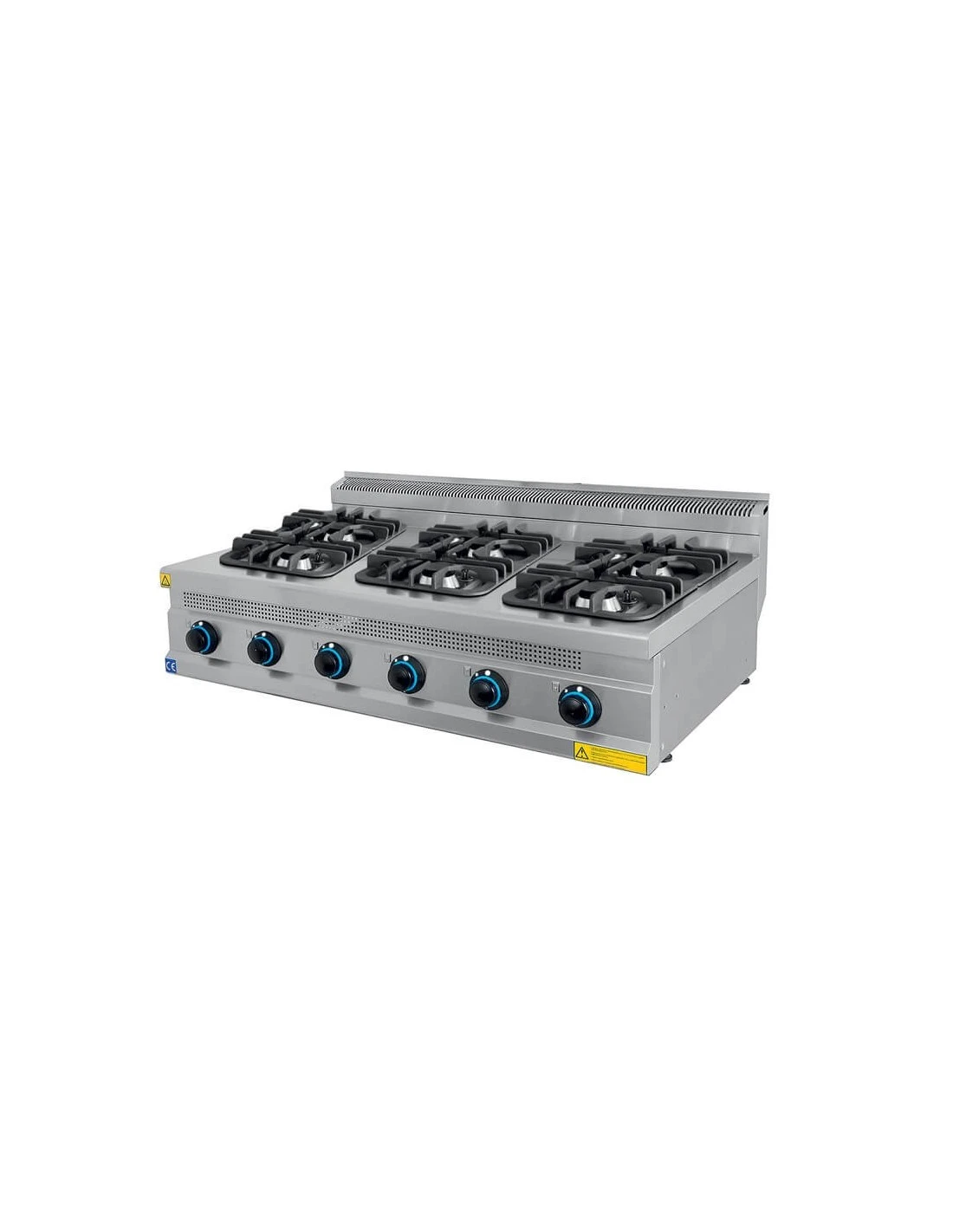 Cucina professionale da banco con alimentazione a gas e una struttura in acciaio inox a 6 fornelli. La cucina è dotata di valvola di sicurezza per il gas, sistema di controllo fuoco, griglia resistente in ghisa di tipo industriale e piedini regolabili. La sua progettazione rende veloce e facile pulirla. Disponibile con impianto sia a GPL che a gas naturale (specificare in fase di ordine). Questa cucina professionale è adatta per ristoranti, mense, pizzerie, gastronomie e per tutte le attività ristorative.