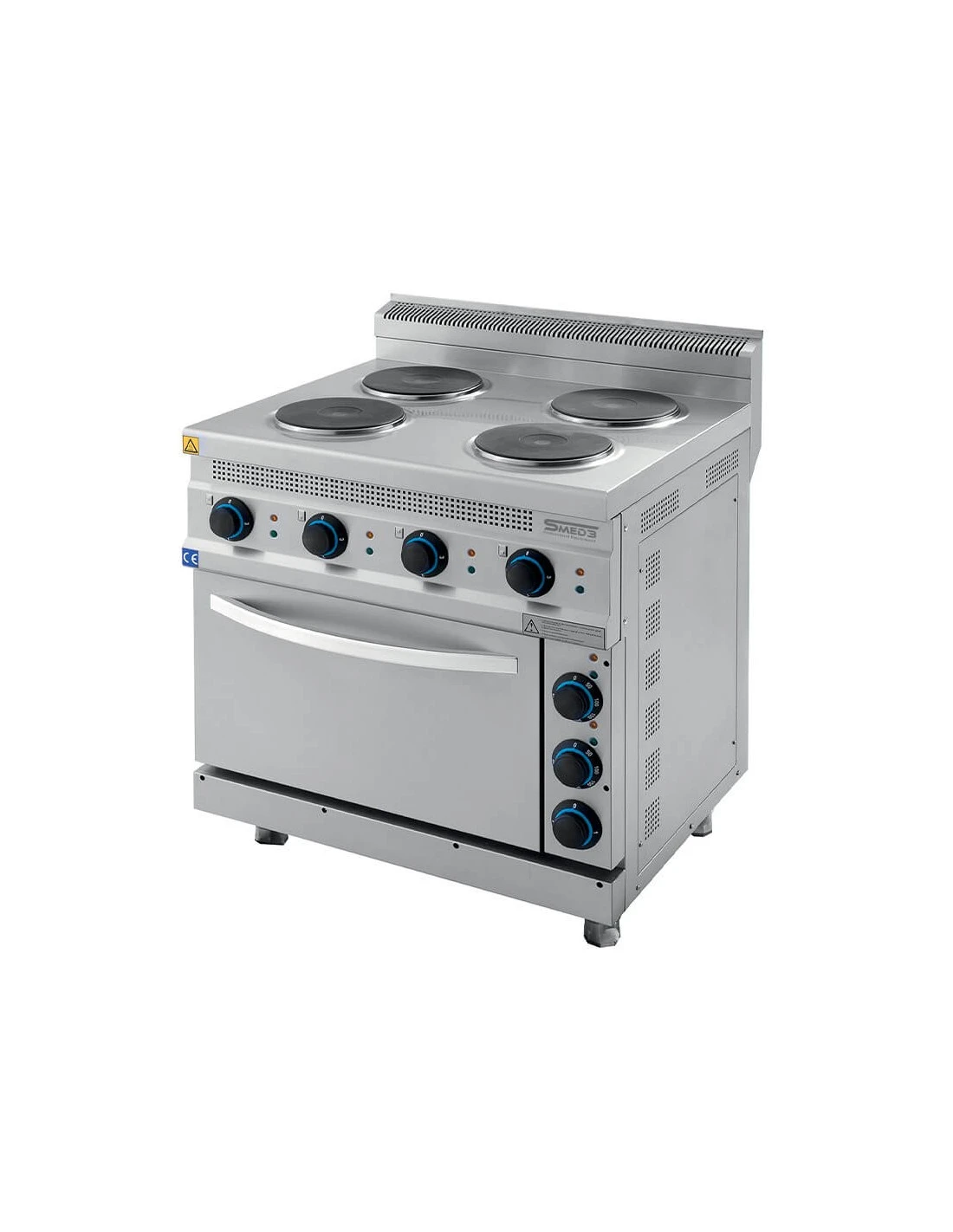 Cucina elettrica in acciaio inox con 4 piastre di 23 cm dotata di sistema di controllo regolabile a 3 livelli. La cucina dispone anche di un forno isolato di misura GN 1/1 con regolazione termostato 50-300°C, griglia removibile di misura GN 1/1 e piedini regolabili. Le resistenze del forno funzionano separatamente. Disponibile nel modello 6 piastre.