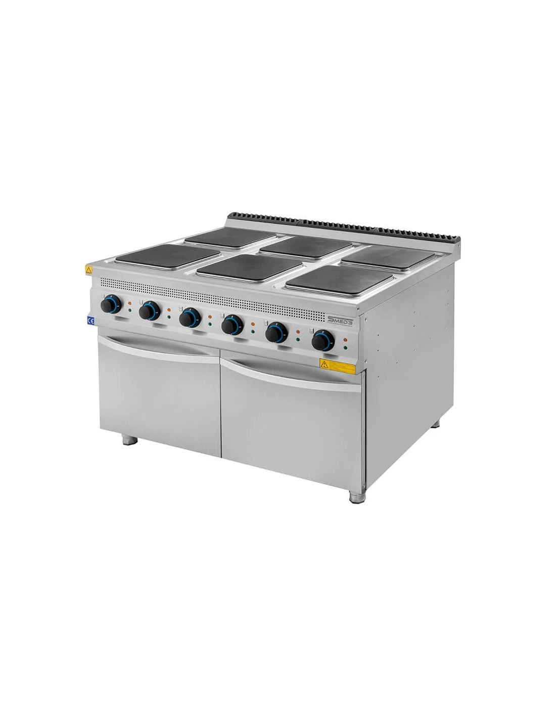 Cucina professionale con alimentazione elettrica con numero 6 piastre per la cottura. Questa cucina con una struttura in acciaio inox ha una semplicità di pulitura aumentando il rendimento del laboratorio.
