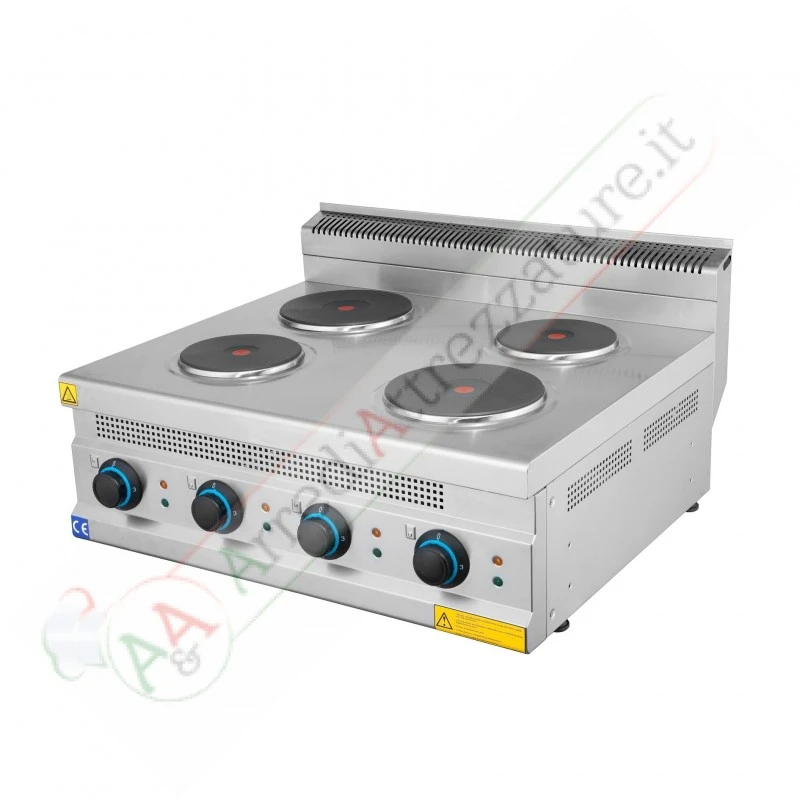 Cucina elettrica da banco in acciaio inox a 4 piastre riscaldanti di 200-230 mm dotata di sistema di controllo regolabile e piedini regolabili. Facile da pulire.