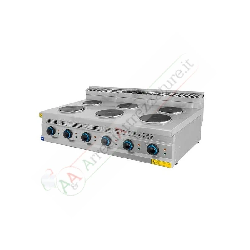 Cucina elettrica da banco in acciaio inox a 6 piastre riscaldanti di 200-230 mm dotata di sistema di controllo regolabile e piedini regolabili. Facile da pulire.