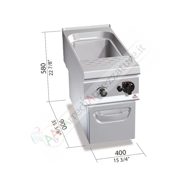 Piano di lavoro in acciaio inox AISI 304 con spessore 20/10, pannelli frontali e laterali in acciaio inox AISI 304, con finitura Scotch Brite. Alte prestazioni garantite da resistenze in acciaio inox incoloy situate direttamente all’interno della vasca e protette dal fondo forato per l’appoggio dei cesti. Comando per la regolazione della potenza erogata con spia di controllo. Vasca stampata con ampi bordi arrotondati realizzata completamente in acciaio inox AISI 316. Circolazione dell’acqua garantita da un fondo forato che distanzia i cesti di 10 cm dal fondo. Troppopieno di grande diametro per l’eliminazione degli amidi in eccesso durante la cottura. Piano di appoggio con funzione sgocciolatoio, smontabile, a filo del piano. Il beccuccio posto sul piano permette di regolare il flusso dell’acqua attraverso un comando posto sul cruscotto. Rubinetto di scarico a sfera, situato all’interno del vano, comandato da maniglia con impugnatura atermica.