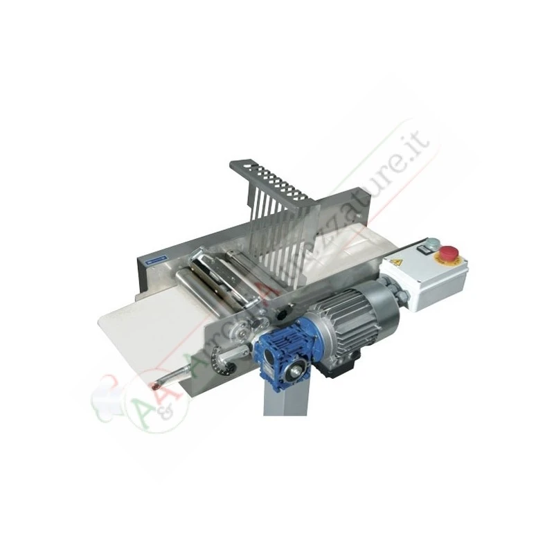 Lavora bene qualsiasi tipo di impasto, senza maltrattarlo. Grazie ad un particolare sistema di avvolgimento ed alla regolazione del cilindro inox, lavora spessori variabili da 2-7 mm. ed è in grado di produrre anche i mini-croissants. Il carico è anteriore mentre i croissants avvolti escono posteriormente e raccolti su teglia. Produzione di circa 800 pezzi/ora. Completamente inox. Ideale per abbinamento con sfogliatrice taglia-triangoli.