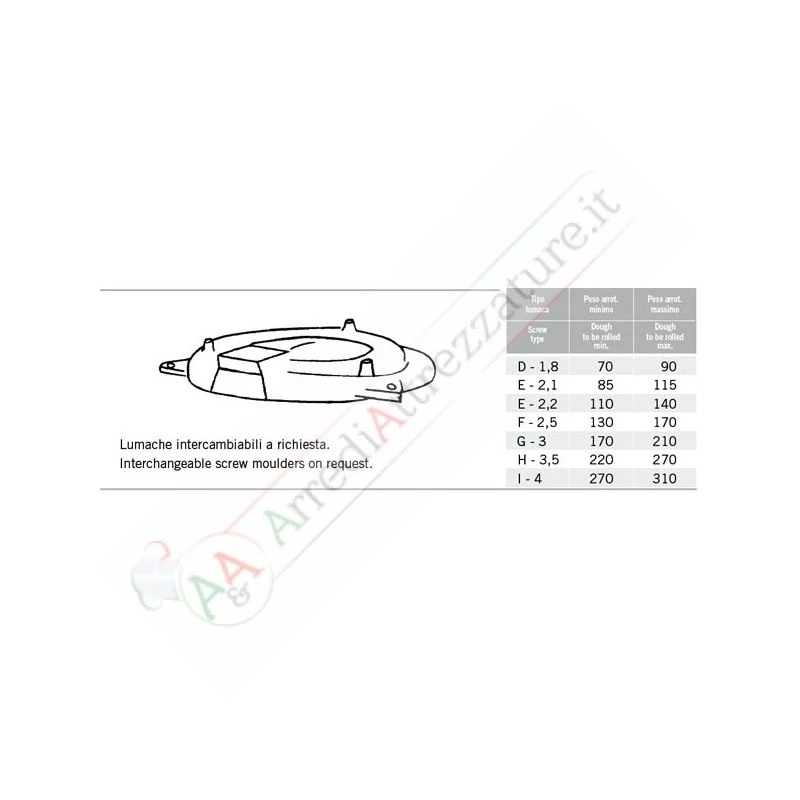 Interamente montata su cuscinetti; non necessita di alcuna manutenzione. La tramoggia di carico ha una capacità di circa 5 kg. La spezzatrice ha una produzione di circa 1.000 pezzi/ora. La grammatura è regolabile da un apposito comando che ha un campo di variazione di circa 70 gr. Nei differenti modelli, a seconda dei rapporti montati, si possono ottenere pesi da un minimo di gr. 100 ad un massimo di gr. 300.