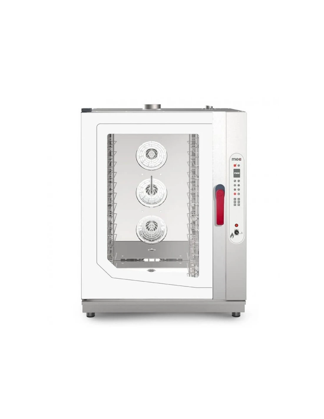 Forno a convezione 10 teglie 60×40 cm e GN 1/1 con alimentazione a gas a vapore diretto per pasticceria e panificazione ad alto rendimento. Guarnizione porta a pressione tipo professionale, camera di cottura con angoli arrotondati per una facile pulizia, porta vetro bassa emissivo, iniezione diretta vapore con regolazione elettronica vapore in percentuale, apertura porta laterale a destra.