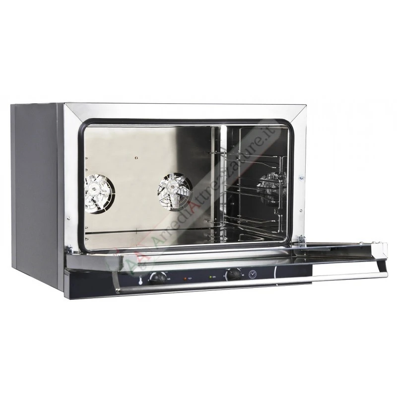 Forno a convezione per 3 teglie da 600×400- Interno ed esterno in Acciaio Inox con finiture esterne in Scoth Bright Camera con angoli arrotondati. Doppio motore e doppia ventola.