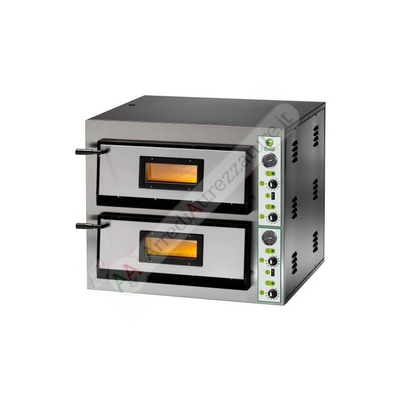 Forni elettrici professionali per la cottura di pizza, focacce, ecc – rivestimento frontale inox o rustico, solo inox per modelli FYL – piano di cottura refrattario – isolamento termico mediante rivestimento in lana di roccia – porte con vetro di ispezione in pirex – pirometri solo per modelli FML – illuminazione interna – 2 termostati per ogni camera.