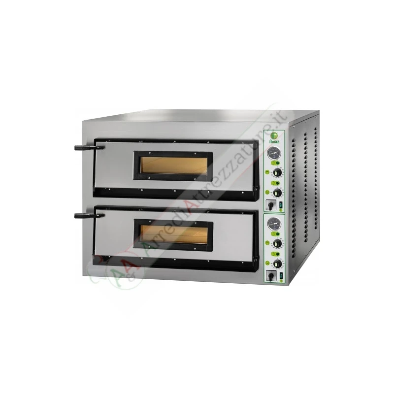 Forni elettrici professionali per la cottura di pizza, focacce, ecc – rivestimento frontale inox o rustico, solo inox per modelli FYL – piano di cottura refrattario – isolamento termico mediante rivestimento in lana di roccia – porte con vetro di ispezione in pirex – pirometri solo per modelli FML – illuminazione interna – 2 termostati per ogni camera.