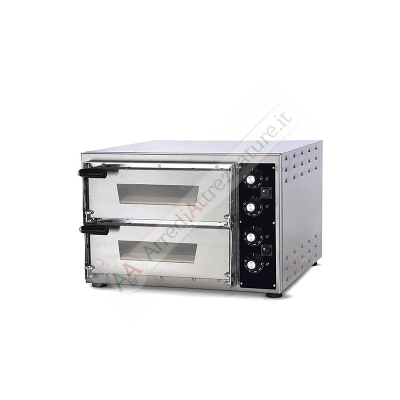 Forno elettrico economico. Versione in acciaio. Luce interna. Superficie di cottura in refrattario certificato per alimenti. 2 termostati per ogni camera.
