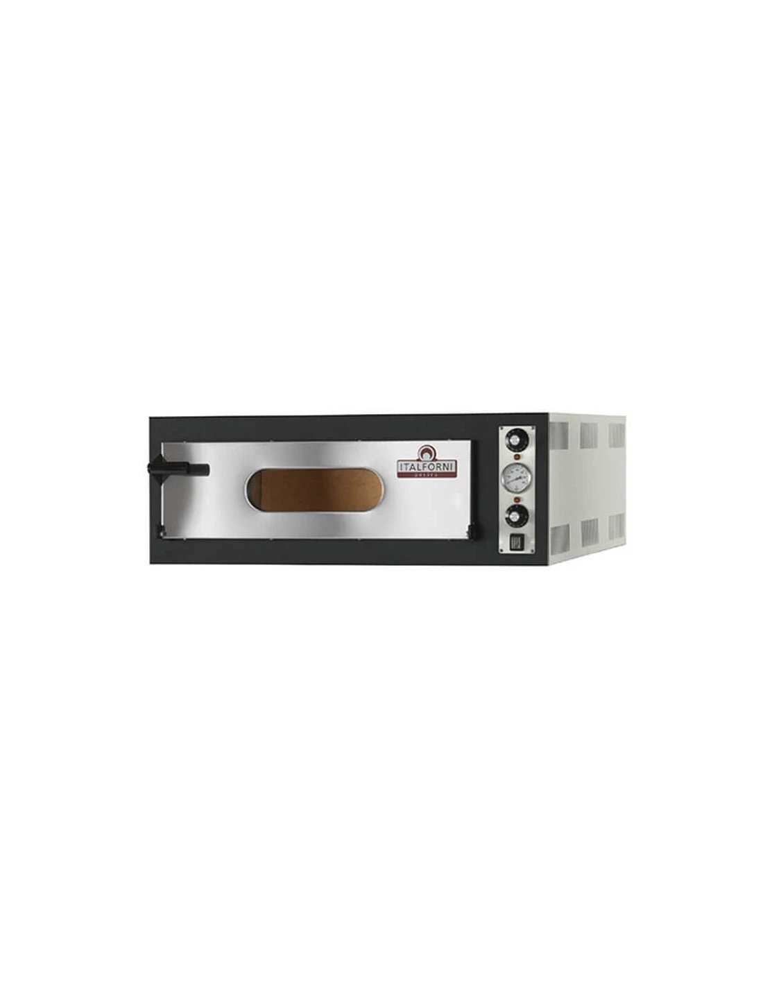 Forno elettrico monocamera professionale 6 pizze per pizzeria, panifici e pasticceria. Camera di cottura in lamiera acciaio alluminata ha una capacità di 6 pizze. Piano in refrattario. Sportello ad apertura controbilanciata. Illuminazione interna protetta. Resistenze corazzate in acciaio inox. Camere indipendenti con regolazione termostatica o elettronica della temperatura separata cielo/piano. Isolamento termico garantito dalla scelta dei migliori materiali presenti sul mercato e dall’esperienza ultratrentennale nella progettazione e costruzione di forni per Alte Temperature