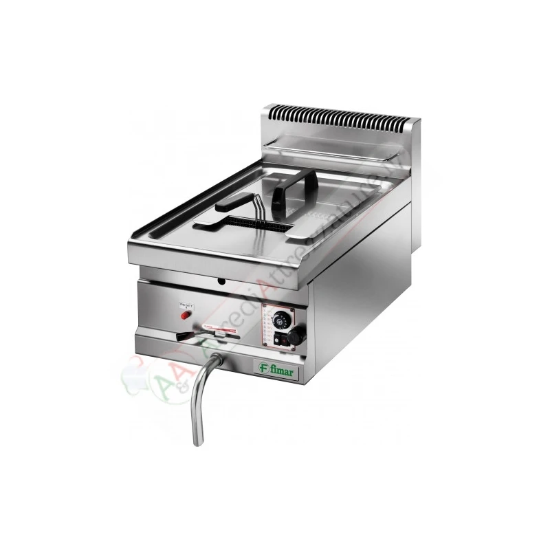 Struttura, coperchi, cestelli e resistenze in acciaio inox – piano di lavoro e vasche stampate in acciaio inox spessore 15/10 – manici cestelli e pomelli coperchi in materiale isolante – termostato a 7 posizioni da 110÷190°C – versione a due vasche con doppio termostato per utilizzo indipendente – bruciatori inox tubolari con sistema turbolatore che rallenta il flusso della fiamma aumentandone la resa di circa il 50%, combustione ottimizzata con valvola termocoppia e termostato di sicurezza – fiamma pilota protetta – accensione con piezoelettrico – alimentazione a metano, in dotazione kit G.P.L.