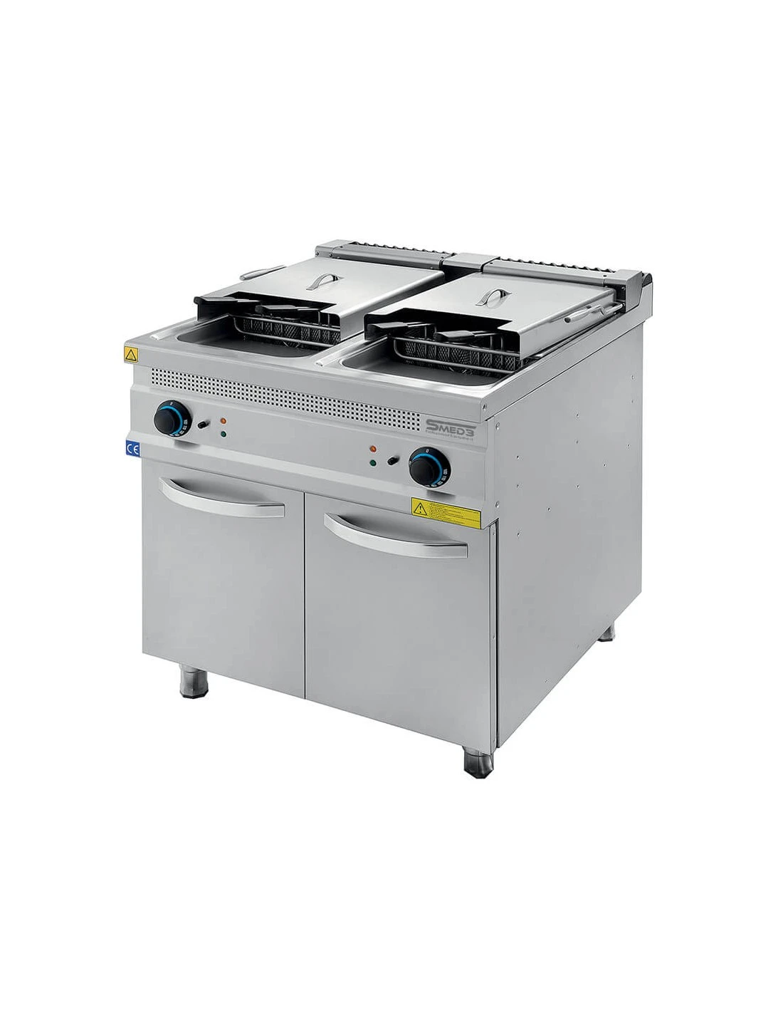 Friggitrice elettrica in acciaio inox con due cestelli monoblocco 24 +24 litri dotata di termostato di sicurezza regolabile 100-180°C, controllo termostatico, tubo per il drenaggio, valvola di svuotamento dell’olio e piedini regolabili. Facile da pulire grazie all’elemento di riscaldamento mobile e di lunga durata.