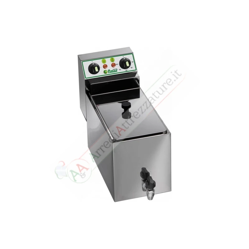 Struttura, vasca e coperchio in acciaio inox – cestelli a rete estraibili in filo cromato – manici cestelli e pomelli coperchi in plastica termoisolante – resistenze inox – termostato 50÷190 ° C – termostato di sicurezza con pulsante di ripristino – versioni a due vasche con doppio termostato per utilizzo indipendente – testata e resistenze removibili.