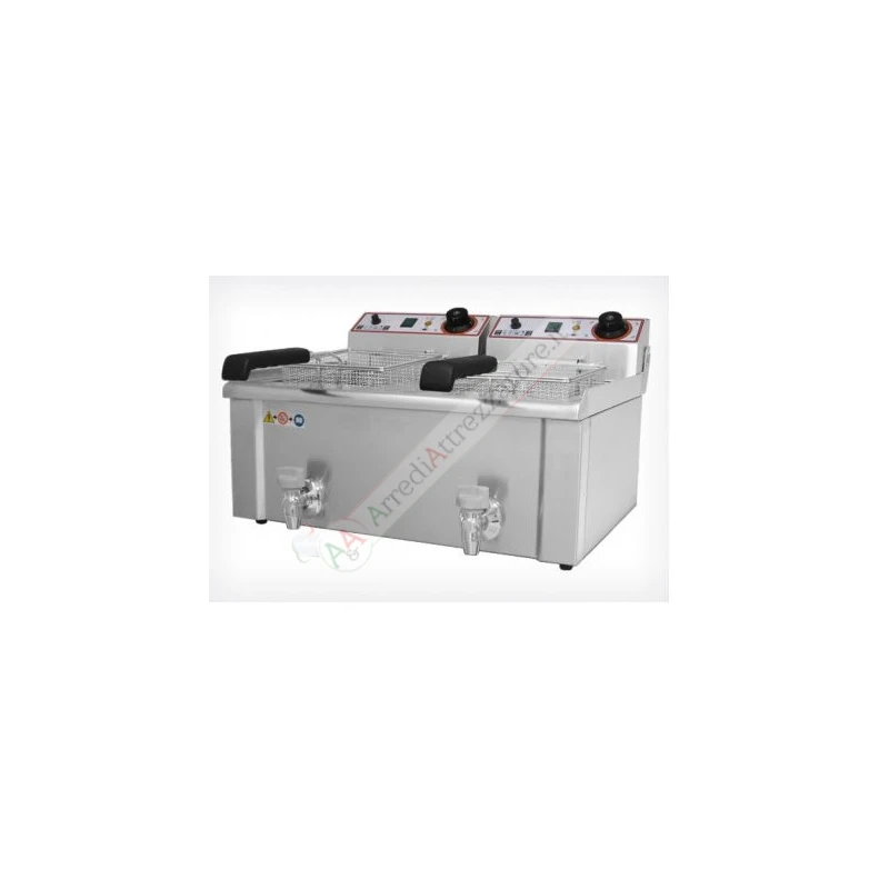 CARATTERISTICHE GENERALI Struttura e vasche in acciaio inox – Termostato di sicurezza ( 240°C)-Temperatura 50°C ~ 190°C-Capacità olio: 9+9 Lt – Rubinetto per scarico olio