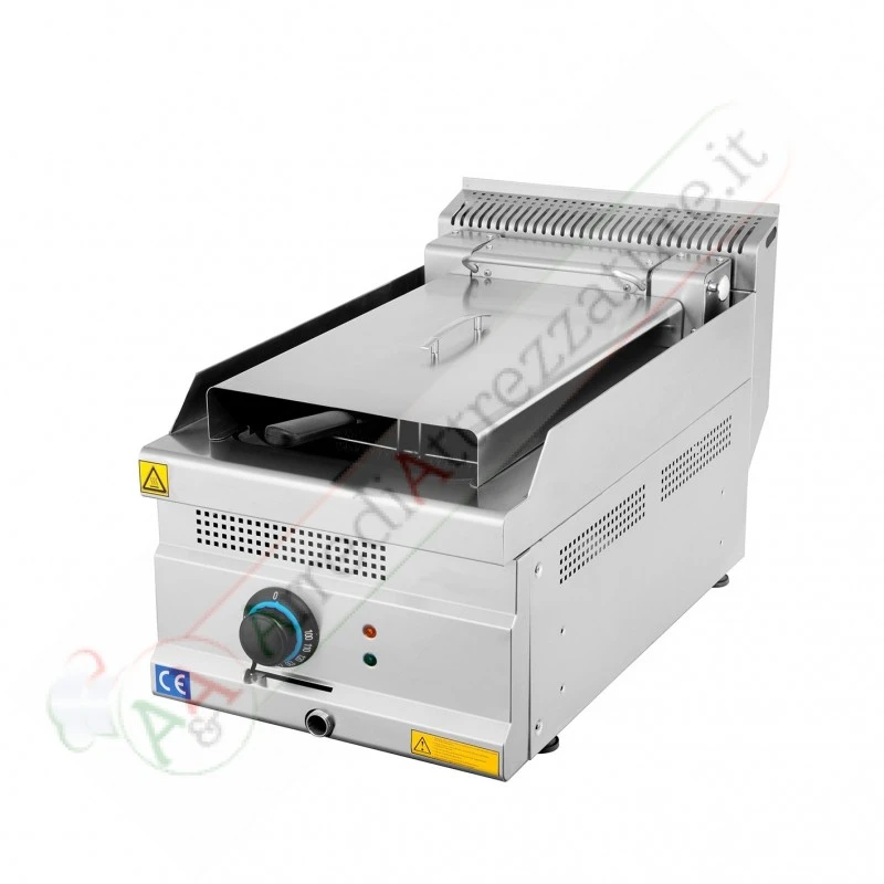 Friggitrice elettrica da banco o su armadio in acciaio inox con vasca monoblocco 12 lt dotata di tubo per drenaggio, termostato di sicurezza regolabile 100-180°C e piedini regolabili. Facile da pulire e di lunga durata.