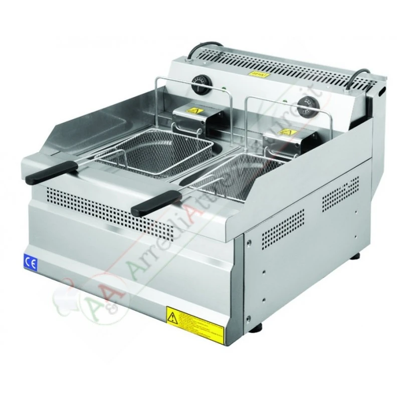 Friggitrice elettrica da banco con doppio cestello 3 + 3 lt / 2+2 lt netti in acciaio inox dotata di termostato regolabile 100-180°C e piedini regolabili, semplice da pulire e di lunga durata.