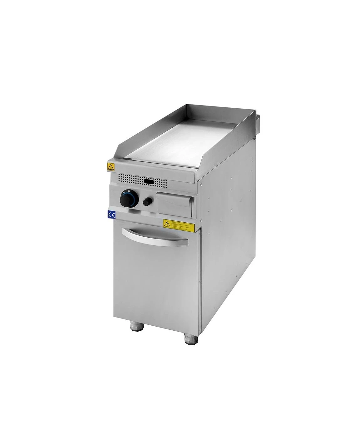 Fry top professionale con alimentazione a gas armadiato in acciaio inox con 1 sportello inferiore (liscia e ondulata) ad equa distribuzione del calore per una cottura omogenea con termostato regolabile, piedini regolabili e vano raccogli grasso estraibile.