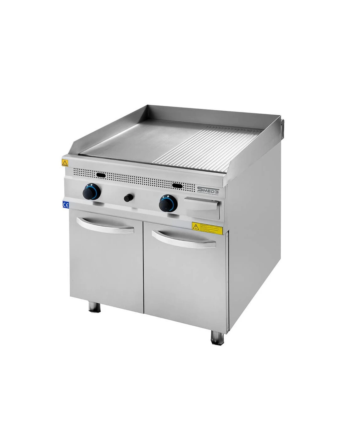 Fry top a gas professionale armadiato in acciaio inox con 2 sportelli inferiori dotato di doppia zona di cottura indipendente (liscia e ondulata) ad equa distribuzione del calore per una cottura omogenea con termostato regolabile, piedini regolabili e vano raccogli grasso estraibile.
