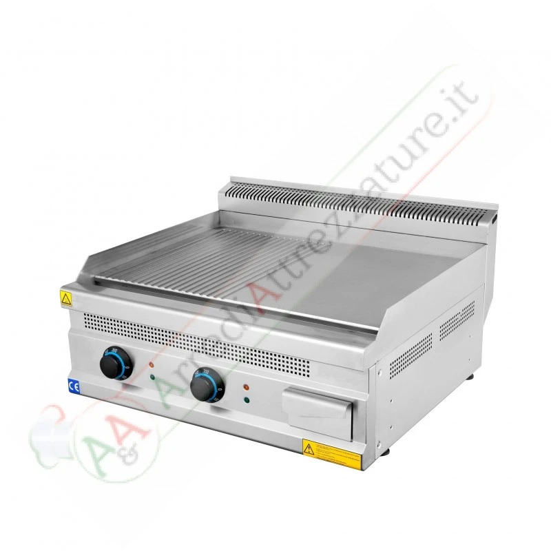 Fry top elettrico professionale in acciaio inox doppia zona di cottura con vano raccogli grasso.
