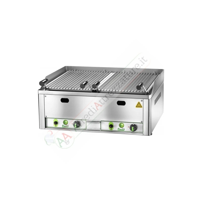 Macchina da banco per cuocere carne, pesce, verdure, ecc. Il funzionamento consiste nel riscaldare la pietra lavica posta su una griglia di supporto in acciaio. Struttura in acciaio inox – griglia di cottura in lamiere piegate a V in acciaio inox – accensione con piezoelettrico – alimentazione metano, in dotazione kit GPL – cassetto raccolta residui di cottura. Optional: Griglia per pesce.