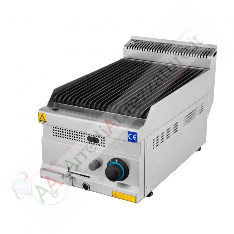 Griglia in ghisa a gas da banco 400 mm con struttura in acciaio inox ad accensione piezoelettrica con fiamma pilota dotata di valvola gas di sicurezza con termocoppia, serbatoio d’acqua per fornire umidità, indicatore del livello d’acqua, vano raccogli grasso estraibile e piedini regolabili. Facile da pulire. Disponibile con impianto sia GPL che a gas naturale (specificare in fase di ordine).