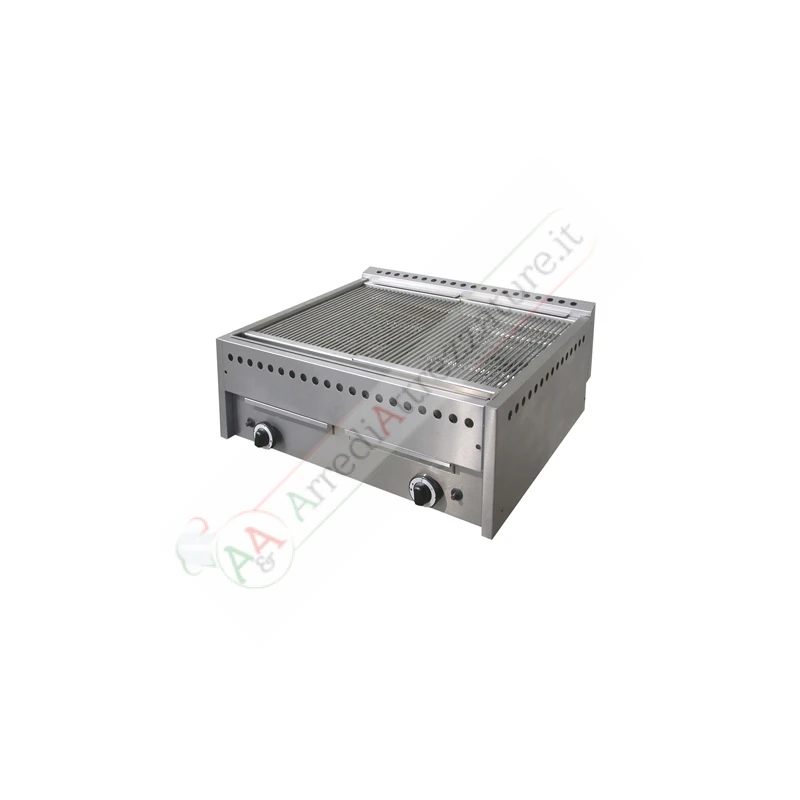 Corpo in acciaio inox, adatta sia ad uso semi professionale che professionale, in dotazione kit ugelli per GPL G30 e gas naturale G20, griglia di cottura in tondini di acciaio inox Ø 6 mm, cassetto raccolta residui di cottura.