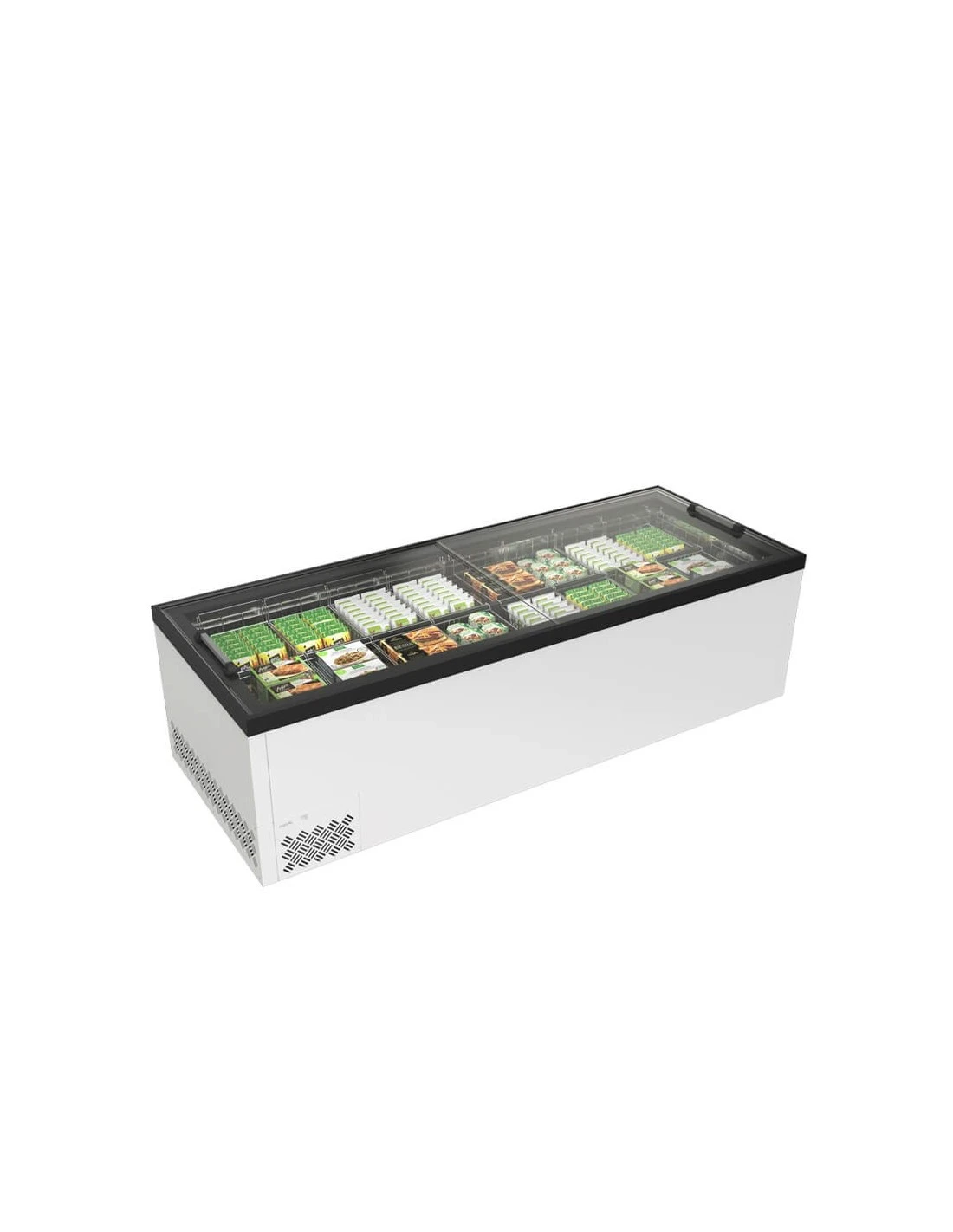 Isola surgelati negativa con vetri scorrevoli con un alta efficienza energetica grazie a 90 mm di isolamento di poliuretano iniettato SENZA HCFC/CFC. Questa isole vetrate negative vetro piano scorrevole ha una refrigerazione statica e una capacità di 1015 litri. La sua temperatura di lavoro che va da -25°C a -18°C. Questa isola congelatore viene spesso usato nei supermarket e minimarket.